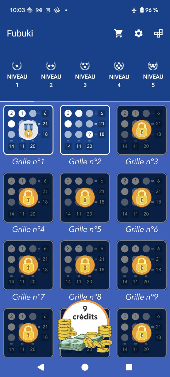 Une application qui permet de jouer, sans connexion internet à plus de 2500 grilles de Fubuki, réparties en 5 niveaux. De nombreux bonus sont disponibles pour aider les joueurs à terminer les grilles.